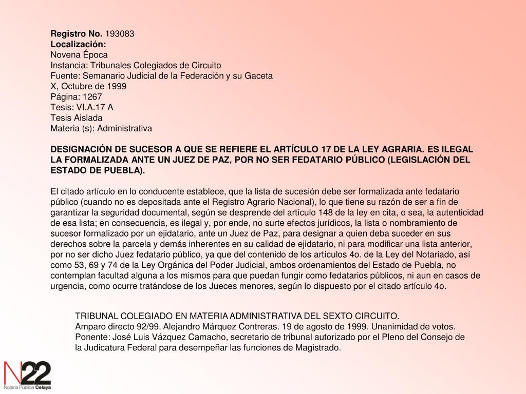 Registro No. 193083Localización:Novena ÉpocaInstancia: Tribunales Colegiados de CircuitoFuente: Semanario Judicial de la Federación y su GacetaX, Octubre de 1999Página: 1267Tesis: VI.A.17 ATesis AisladaMateria (s): AdministrativaDESIGNACIÓN DE SUCESOR A QUE SE REFIERE EL ARTÍCULO 17 DE LA LEY AGRARIA. ES ILEGAL LA FORMALIZADA ANTE UN JUEZ DE PAZ, POR NO SER FEDATARIO PÚBLICO (LEGISLACIÓN DEL ESTADO DE PUEBLA).El citado artículo en lo conducente establece, que la lista de sucesión debe ser formalizada ante fedatario público (cuando no es depositada ante el Registro Agrario Nacional), lo que tiene su razón de ser a fin de garantizar la seguridad documental, según se desprende del artículo 148 de la ley en cita, o sea, la autenticidad de esa lista; en consecuencia, es ilegal y, por ende, no surte efectos jurídicos, la lista o nombramiento de sucesor formalizado por un ejidatario, ante un Juez de Paz, para designar a quien deba suceder en sus derechos sobre la parcela y demás inherentes en su calidad de ejidatario, ni para modificar una lista anterior, por no ser dicho Juez fedatario público, ya que del contenido de los artículos 4o. de la Ley del Notariado, así como 53, 69 y 74 de la Ley Orgánica del Poder Judicial, ambos ordenamientos del Estado de Puebla, no contemplan facultad alguna a los mismos para que puedan fungir como fedatarios públicos, ni aun en casos de urgencia, como ocurre tratándose de los Jueces menores, según lo dispuesto por el citado artículo 4o. TRIBUNAL COLEGIADO EN MATERIA ADMINISTRATIVA DEL SEXTO CIRCUITO. Amparo directo 92/99. Alejandro Márquez Contreras. 19 de agosto de 1999. Unanimidad de votos. Ponente: José Luis Vázquez Camacho, secretario de tribunal autorizado por el Pleno del Consejo de la Judicatura Federal para desempeñar las funciones de Magistrado.