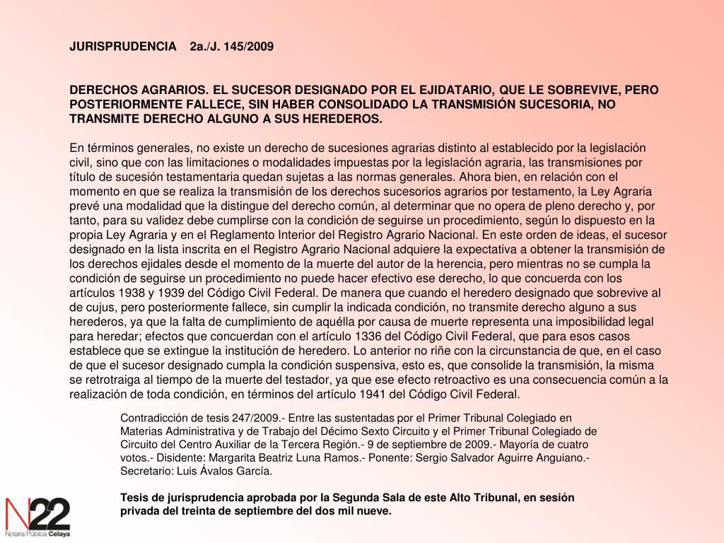 JURISPRUDENCIA 2a./J. 145/2009DERECHOS AGRARIOS. EL SUCESOR DESIGNADO POR EL EJIDATARIO, QUE LE SOBREVIVE, PERO POSTERIORMENTE FALLECE, SIN HABER CONSOLIDADO LA TRANSMISIÓN SUCESORIA, NO TRANSMITE DERECHO ALGUNO A SUS HEREDEROS. En términos generales, no existe un derecho de sucesiones agrarias distinto al establecido por la legislación civil, sino que con las limitaciones o modalidades impuestas por la legislación agraria, las transmisiones por título de sucesión testamentaria quedan sujetas a las normas generales. Ahora bien, en relación con el momento en que se realiza la transmisión de los derechos sucesorios agrarios por testamento, la Ley Agraria prevé una modalidad que la distingue del derecho común, al determinar que no opera de pleno derecho y, por tanto, para su validez debe cumplirse con la condición de seguirse un procedimiento, según lo dispuesto en la propia Ley Agraria y en el Reglamento Interior del Registro Agrario Nacional. En este orden de ideas, el sucesor designado en la lista inscrita en el Registro Agrario Nacional adquiere la expectativa a obtener la transmisión de los derechos ejidales desde el momento de la muerte del autor de la herencia, pero mientras no se cumpla la condición de seguirse un procedimiento no puede hacer efectivo ese derecho, lo que concuerda con los artículos 1938 y 1939 del Código Civil Federal. De manera que cuando el heredero designado que sobrevive al de cujus, pero posteriormente fallece, sin cumplir la indicada condición, no transmite derecho alguno a sus herederos, ya que la falta de cumplimiento de aquélla por causa de muerte representa una imposibilidad legal para heredar; efectos que concuerdan con el artículo 1336 del Código Civil Federal, que para esos casos establece que se extingue la institución de heredero. Lo anterior no riñe con la circunstancia de que, en el caso de que el sucesor designado cumpla la condición suspensiva, esto es, que consolide la transmisión, la misma se retrotraiga al tiempo de la muerte del testador, ya que ese efecto retroactivo es una consecuencia común a la realización de toda condición, en términos del artículo 1941 del Código Civil Federal. Contradicción de tesis 247/2009.- Entre las sustentadas por el Primer Tribunal Colegiado en Materias Administrativa y de Trabajo del Décimo Sexto Circuito y el Primer Tribunal Colegiado de Circuito del Centro Auxiliar de la Tercera Región.- 9 de septiembre de 2009.- Mayoría de cuatro votos.- Disidente: Margarita Beatriz Luna Ramos.- Ponente: Sergio Salvador Aguirre Anguiano.- Secretario: Luis Ávalos García. Tesis de jurisprudencia aprobada por la Segunda Sala de este Alto Tribunal, en sesión privada del treinta de septiembre del dos mil nueve.