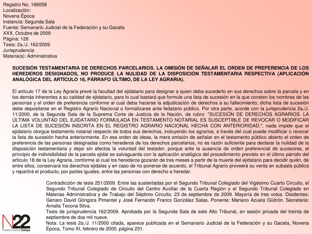 Registro No. 166058 • Localización: • Novena Época • Instancia: Segunda Sala • Fuente: Semanario Judicial de la Federación y su Gaceta • XXX, Octubre de 2009 • Página: 126 • Tesis: 2a./J. 162/2009 • Jurisprudencia • Materia(s): Administrativa • SUCESIÓN TESTAMENTARIA DE DERECHOS PARCELARIOS. LA OMISIÓN DE SEÑALAR EL ORDEN DE PREFERENCIA DE LOS HEREDEROS DESIGNADOS, NO PRODUCE LA NULIDAD DE LA DISPOSICIÓN TESTAMENTARIA RESPECTIVA (APLICACIÓN ANALÓGICA DEL ARTÍCULO 18, PÁRRAFO ÚLTIMO, DE LA LEY AGRARIA). • El artículo 17 de la Ley Agraria prevé la facultad del ejidatario para designar a quien deba sucederlo en sus derechos sobre la parcela y en los demás inherentes a su calidad de ejidatario, para lo cual bastará que formule una lista de sucesión en la que consten los nombres de las personas y el orden de preferencia conforme al cual deba hacerse la adjudicación de derechos a su fallecimiento; dicha lista de sucesión debe depositarse en el Registro Agrario Nacional o formalizarse ante fedatario público. Por otra parte, acorde con la jurisprudencia 2a./J. 11/2000, de la Segunda Sala de la Suprema Corte de Justicia de la Nación, de rubro: "SUCESIÓN DE DERECHOS AGRARIOS. LA ÚLTIMA VOLUNTAD DEL EJIDATARIO FORMULADA EN TESTAMENTO NOTARIAL ES SUSCEPTIBLE DE REVOCAR O MODIFICAR LA LISTA DE SUCESIÓN INSCRITA EN EL REGISTRO AGRARIO NACIONAL HECHA CON ANTERIORIDAD.", nada impide que el ejidatario otorgue testamento notarial respecto de todos sus derechos, incluyendo los agrarios, a través del cual puede modificar o revocar la lista de sucesión hecha anteriormente. En ese orden de ideas, la mera omisión de señalar en el testamento público abierto el orden de preferencia de las personas designadas como herederos de los derechos parcelarios, no es razón suficiente para declarar la nulidad de la disposición testamentaria y dejar sin efectos la voluntad del testador, porque ante la ausencia de orden preferencial de sucesores, el principio de indivisibilidad de la parcela ejidal se salvaguarda con la aplicación analógica del procedimiento previsto en el último párrafo del artículo 18 de la Ley Agraria, conforme al cual los herederos gozarán de tres meses a partir de la muerte del ejidatario para decidir quién, de entre ellos, conservará los derechos ejidales y en caso de no ponerse de acuerdo, el Tribunal Agrario proveerá su venta en subasta pública y repartirá el producto, por partes iguales, entre las personas con derecho a heredar. • Contradicción de tesis 251/2009. Entre las sustentadas por el Segundo Tribunal Colegiado del Vigésimo Cuarto Circuito, el Segundo Tribunal Colegiado de Circuito del Centro Auxiliar de la Cuarta Región y el Segundo Tribunal Colegiado en Materias Administrativa y de Trabajo del Séptimo Circuito. 23 de septiembre de 2009. Mayoría de tres votos. Disidentes: Genaro David Góngora Pimentel y José Fernando Franco González Salas. Ponente: Mariano Azuela Güitrón. Secretaria: Amalia Tecona Silva. • Tesis de jurisprudencia 162/2009. Aprobada por la Segunda Sala de este Alto Tribunal, en sesión privada del treinta de septiembre de dos mil nueve. • Nota: La tesis 2a./J. 11/2000 citada, aparece publicada en el Semanario Judicial de la Federación y su Gaceta, Novena Época, Tomo XI, febrero de 2000, página 231.