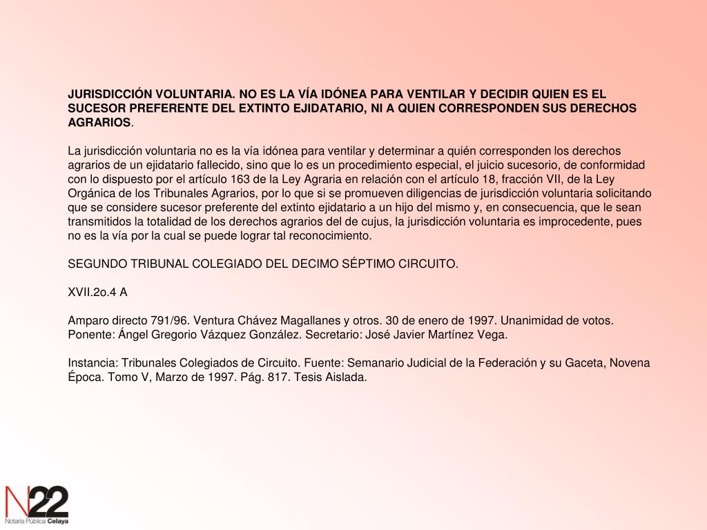 JURISDICCIÓN VOLUNTARIA. NO ES LA VÍA IDÓNEA PARA VENTILAR Y DECIDIR QUIEN ES EL SUCESOR PREFERENTE DEL EXTINTO EJIDATARIO, NI A QUIEN CORRESPONDEN SUS DERECHOS AGRARIOS. La jurisdicción voluntaria no es la vía idónea para ventilar y determinar a quién corresponden los derechos agrarios de un ejidatario fallecido, sino que lo es un procedimiento especial, el juicio sucesorio, de conformidad con lo dispuesto por el artículo 163 de la Ley Agraria en relación con el artículo 18, fracción VII, de la Ley Orgánica de los Tribunales Agrarios, por lo que si se promueven diligencias de jurisdicción voluntaria solicitando que se considere sucesor preferente del extinto ejidatario a un hijo del mismo y, en consecuencia, que le sean transmitidos la totalidad de los derechos agrarios del de cujus, la jurisdicción voluntaria es improcedente, pues no es la vía por la cual se puede lograr tal reconocimiento.SEGUNDO TRIBUNAL COLEGIADO DEL DECIMO SÉPTIMO CIRCUITO. XVII.2o.4 A Amparo directo 791/96. Ventura Chávez Magallanes y otros. 30 de enero de 1997. Unanimidad de votos. Ponente: Ángel Gregorio Vázquez González. Secretario: José Javier Martínez Vega. Instancia: Tribunales Colegiados de Circuito. Fuente: Semanario Judicial de la Federación y su Gaceta, Novena Época. Tomo V, Marzo de 1997. Pág. 817. Tesis Aislada.
