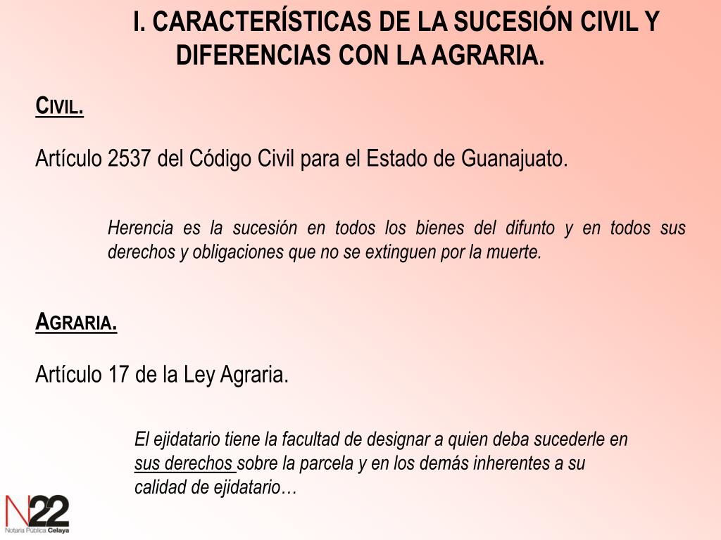 I.CARACTERÍSTICAS DE LA SUCESIÓN CIVIL Y DIFERENCIAS CON LA AGRARIA. • Civil. • Artículo 2537 del Código Civil para el Estado de Guanajuato. • Herencia es la sucesión en todos los bienes del difunto y en todos sus derechos y obligaciones que no se extinguen por la muerte. • Agraria. • Artículo 17 de la Ley Agraria. • El ejidatario tiene la facultad de designar a quien deba sucederle en sus derechos sobre la parcela y en los demás inherentes a su calidad de ejidatario…