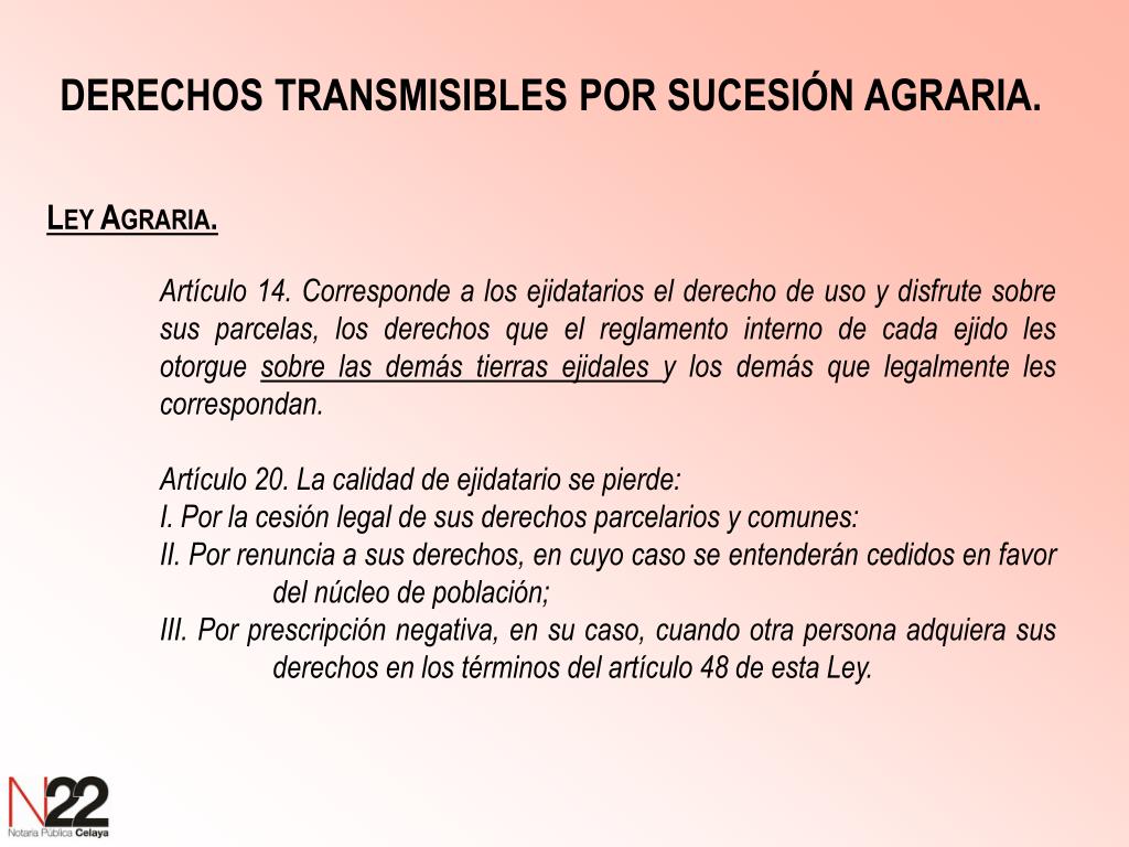 DERECHOS TRANSMISIBLES POR SUCESIÓN AGRARIA. Ley Agraria. Artículo 14. Corresponde a los ejidatarios el derecho de uso y disfrute sobre sus parcelas, los derechos que el reglamento interno de cada ejido les otorgue sobre las demás tierras ejidales y los demás que legalmente les correspondan. Artículo 20. La calidad de ejidatario se pierde: I. Por la cesión legal de sus derechos parcelarios y comunes: II. Por renuncia a sus derechos, en cuyo caso se entenderán cedidos en favor del núcleo de población; III. Por prescripción negativa, en su caso, cuando otra persona adquiera sus derechos en los términos del artículo 48 de esta Ley.