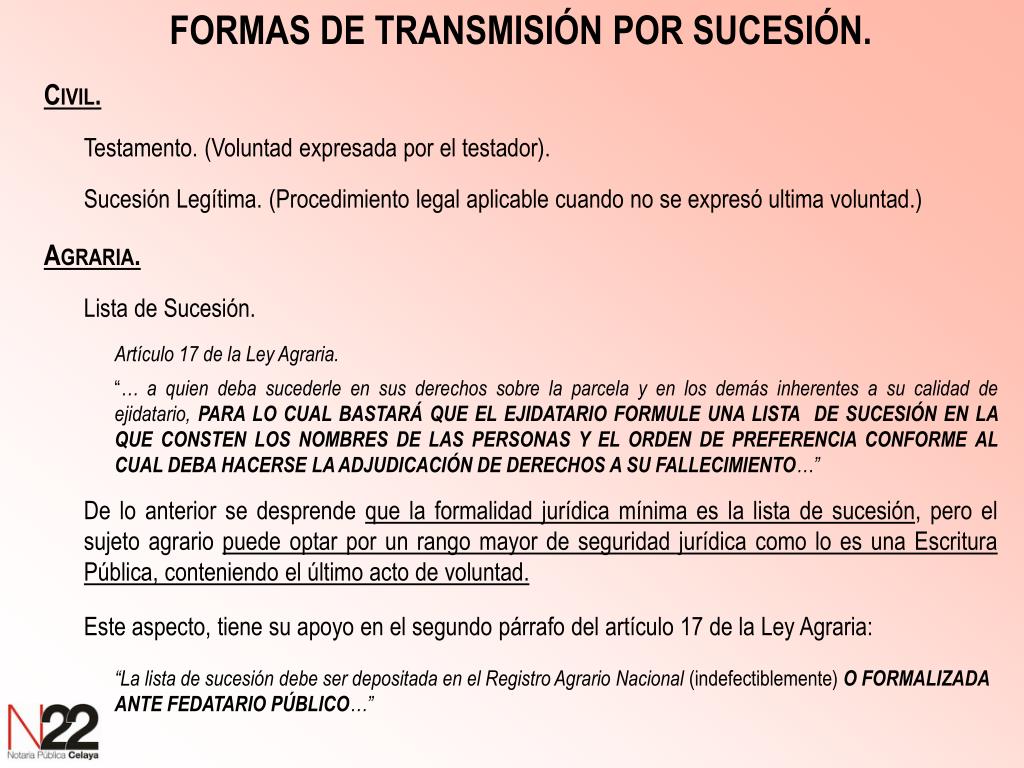 FORMAS DE TRANSMISIÓN POR SUCESIÓN. • Civil. • Testamento. (Voluntad expresada por el testador). • Sucesión Legítima. (Procedimiento legal aplicable cuando no se expresó ultima voluntad.) • Agraria. • Lista de Sucesión. • Artículo 17 de la Ley Agraria. • “… a quien deba sucederle en sus derechos sobre la parcela y en los demás inherentes a su calidad de ejidatario, PARA LO CUAL BASTARÁ QUE EL EJIDATARIO FORMULE UNA LISTA DE SUCESIÓN EN LA QUE CONSTEN LOS NOMBRES DE LAS PERSONAS Y EL ORDEN DE PREFERENCIA CONFORME AL CUAL DEBA HACERSE LA ADJUDICACIÓN DE DERECHOS A SU FALLECIMIENTO…” • De lo anterior se desprende que la formalidad jurídica mínima es la lista de sucesión, pero el sujeto agrario puede optar por un rango mayor de seguridad jurídica como lo es una Escritura Pública, conteniendo el último acto de voluntad. • Este aspecto, tiene su apoyo en el segundo párrafo del artículo 17 de la Ley Agraria: • “La lista de sucesión debe ser depositada en el Registro Agrario Nacional (indefectiblemente) O FORMALIZADA ANTE FEDATARIO PÚBLICO…”