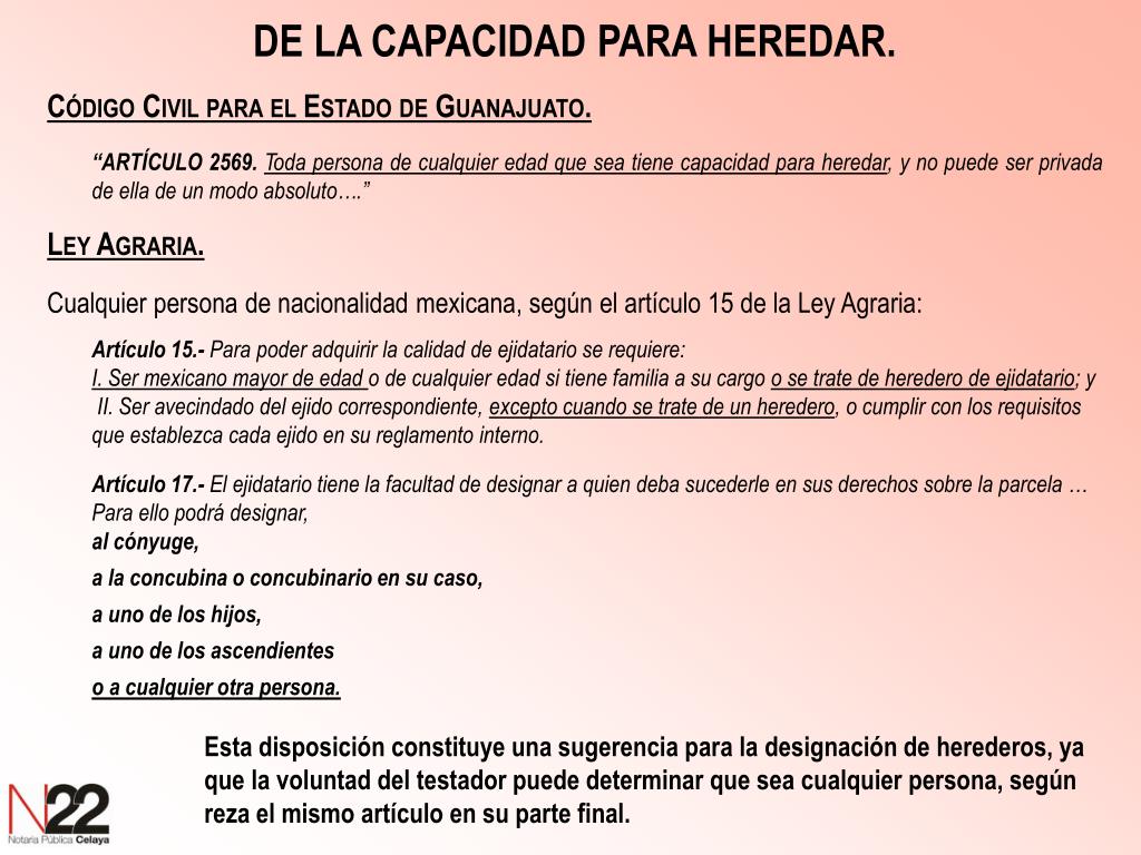 DE LA CAPACIDAD PARA HEREDAR. Código Civil para el Estado de Guanajuato. “ARTÍCULO2569.Toda persona de cualquier edad que sea tiene capacidad para heredar, y no puede ser privada de ella de un modo absoluto….” Ley Agraria. Cualquier persona de nacionalidad mexicana, según el artículo 15 de la Ley Agraria: Artículo 15.- Para poder adquirir la calidad de ejidatario se requiere: I. Ser mexicano mayor de edad o de cualquier edad si tiene familia a su cargo o se trate de heredero de ejidatario; y II. Ser avecindado del ejido correspondiente, excepto cuando se trate de un heredero, o cumplir con los requisitos que establezca cada ejido en su reglamento interno. Artículo 17.- El ejidatario tiene la facultad de designar a quien deba sucederle en sus derechos sobre la parcela … Para ello podrá designar, al cónyuge, a la concubina o concubinario en su caso, a uno de los hijos, a uno de los ascendientes o a cualquier otra persona. Esta disposición constituye una sugerencia para la designación de herederos, ya que la voluntad del testador puede determinar que sea cualquier persona, según reza el mismo artículo en su parte final.