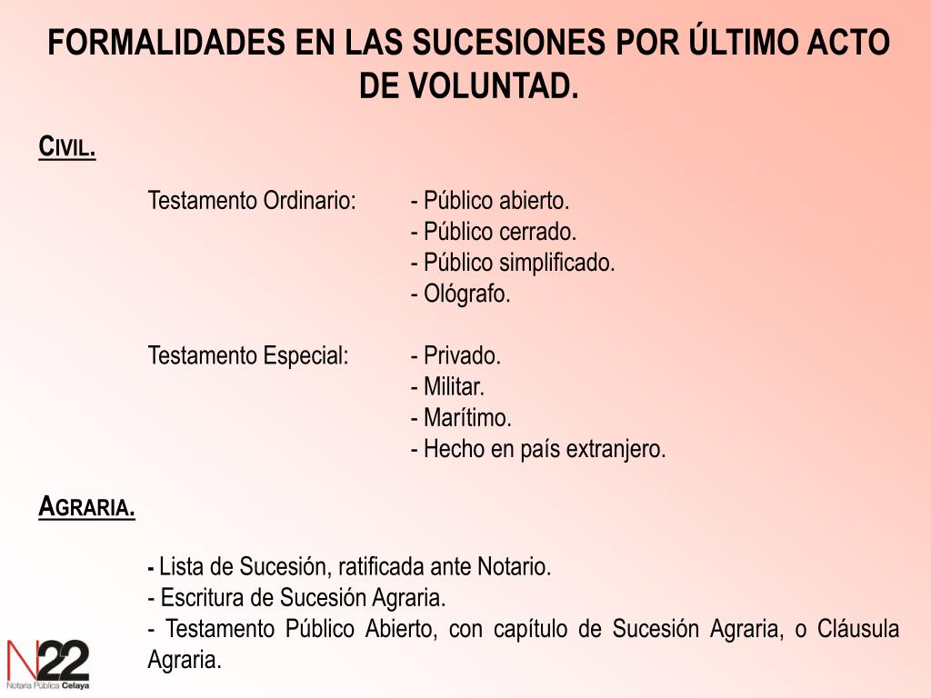 FORMALIDADES EN LAS SUCESIONES POR ÚLTIMO ACTO DE VOLUNTAD. • Civil. • Testamento Ordinario: - Público abierto. • - Público cerrado. • - Público simplificado. • - Ológrafo. • Testamento Especial: - Privado. • - Militar. • - Marítimo. • - Hecho en país extranjero. • Agraria. • -Lista de Sucesión, ratificada ante Notario. • Escritura de SucesiónAgraria. • - Testamento Público Abierto, con capítulo de Sucesión Agraria, o Cláusula Agraria.