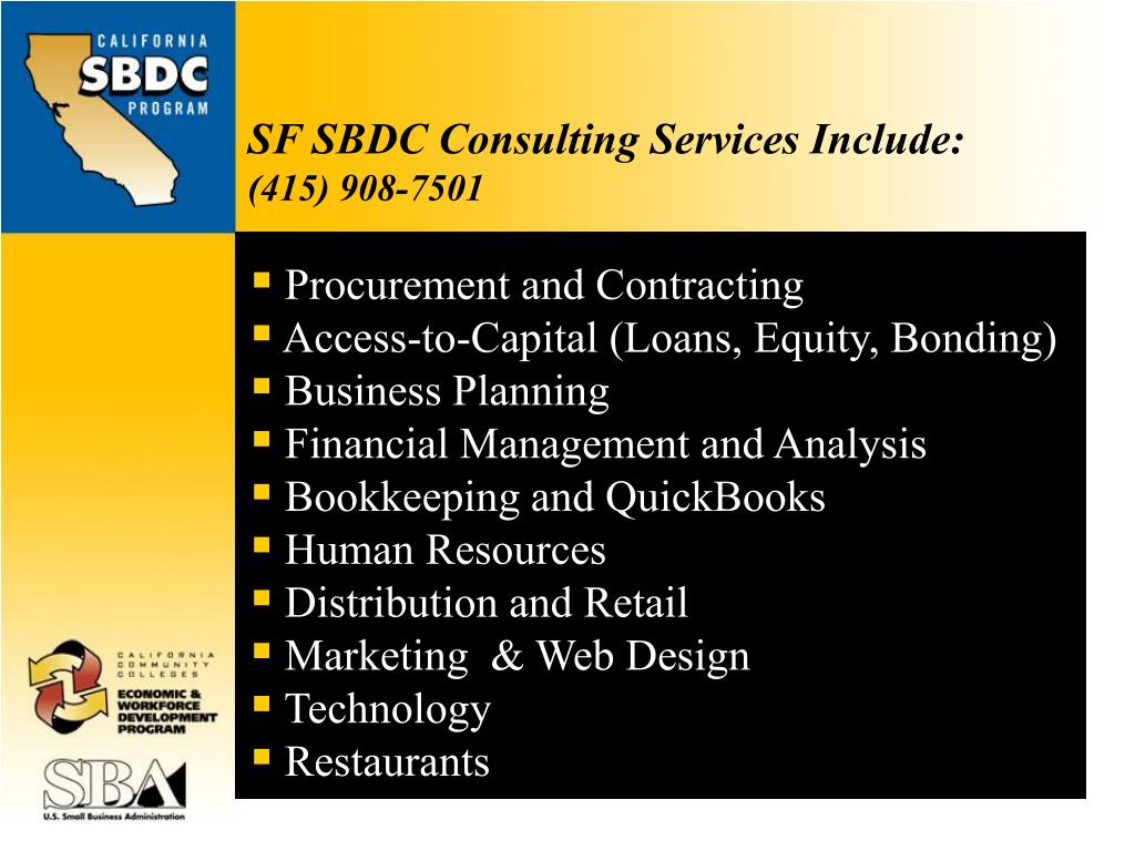SF SBDC Consulting Services Include:(415) 908-7501 • Procurement and Contracting • Access-to-Capital (Loans, Equity, Bonding) • Business Planning • Financial Management and Analysis • Bookkeeping and QuickBooks • Human Resources • Distribution and Retail • Marketing & Web Design • Technology • Restaurants
