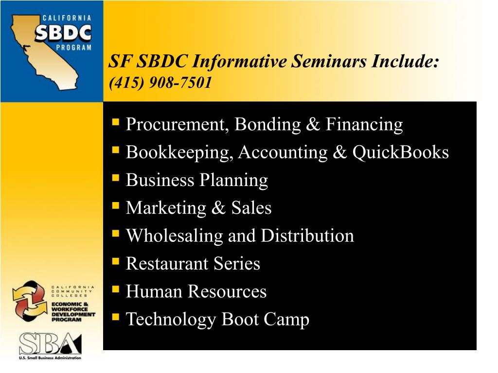 SF SBDC Informative Seminars Include:(415) 908-7501 • Procurement, Bonding & Financing • Bookkeeping, Accounting & QuickBooks • Business Planning • Marketing & Sales • Wholesaling and Distribution • Restaurant Series • Human Resources • Technology Boot Camp