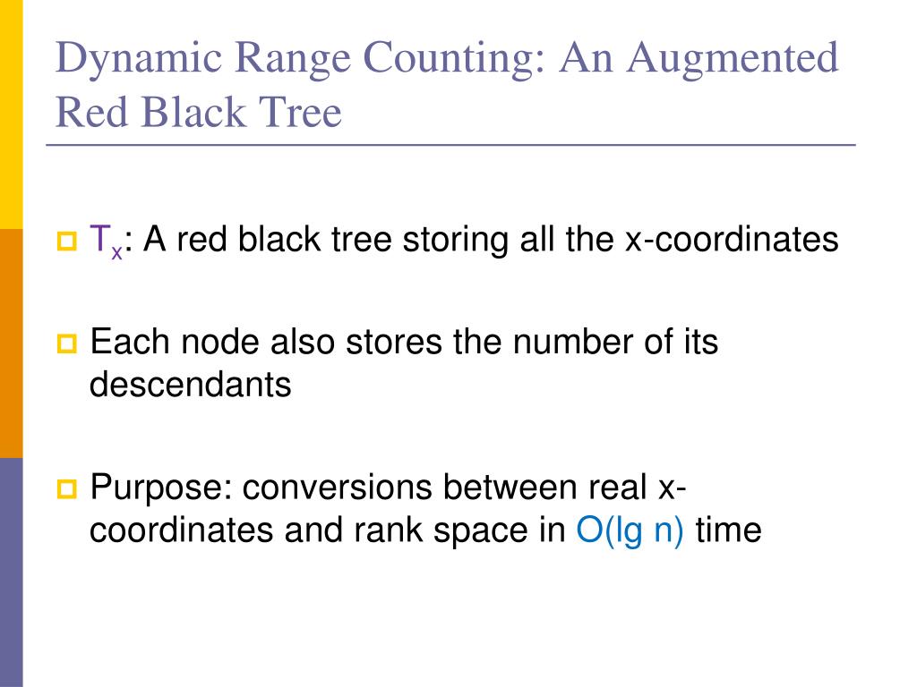 Dynamic Range Counting: An Augmented Red Black Tree • Tx: A red black tree storing all the x-coordinates • Each node also stores the number of its descendants • Purpose: conversions between real x-coordinates and rank space in O(lg n) time