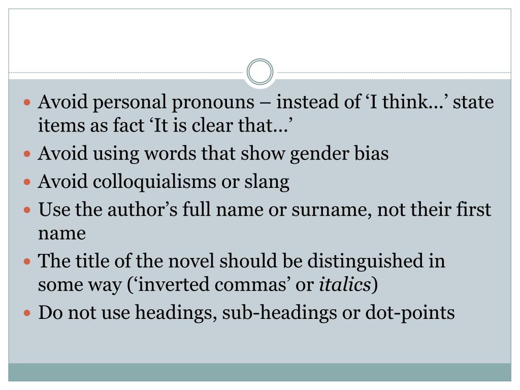 Things to avoid!!!! Avoid personal pronouns – instead of ‘I think...’ state items as fact ‘It is clear that...’ Avoid using words that show gender bias Avoid colloquialisms or slang Use the author’s full name or surname, not their first name The title of the novel should be distinguished in some way (‘inverted commas’ or italics) Do not use headings, sub-headings or dot-points