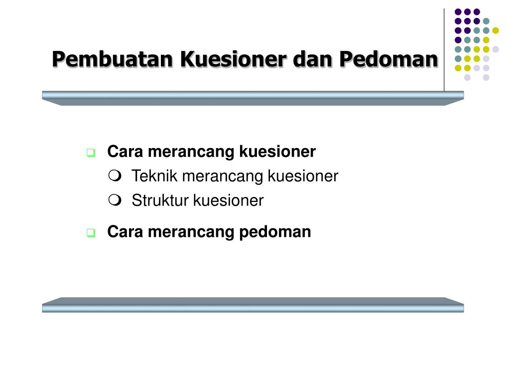 Pembuatan Kuesioner dan Pedoman • Cara merancang kuesioner Teknik merancang kuesioner Struktur kuesioner • Cara merancang pedoman