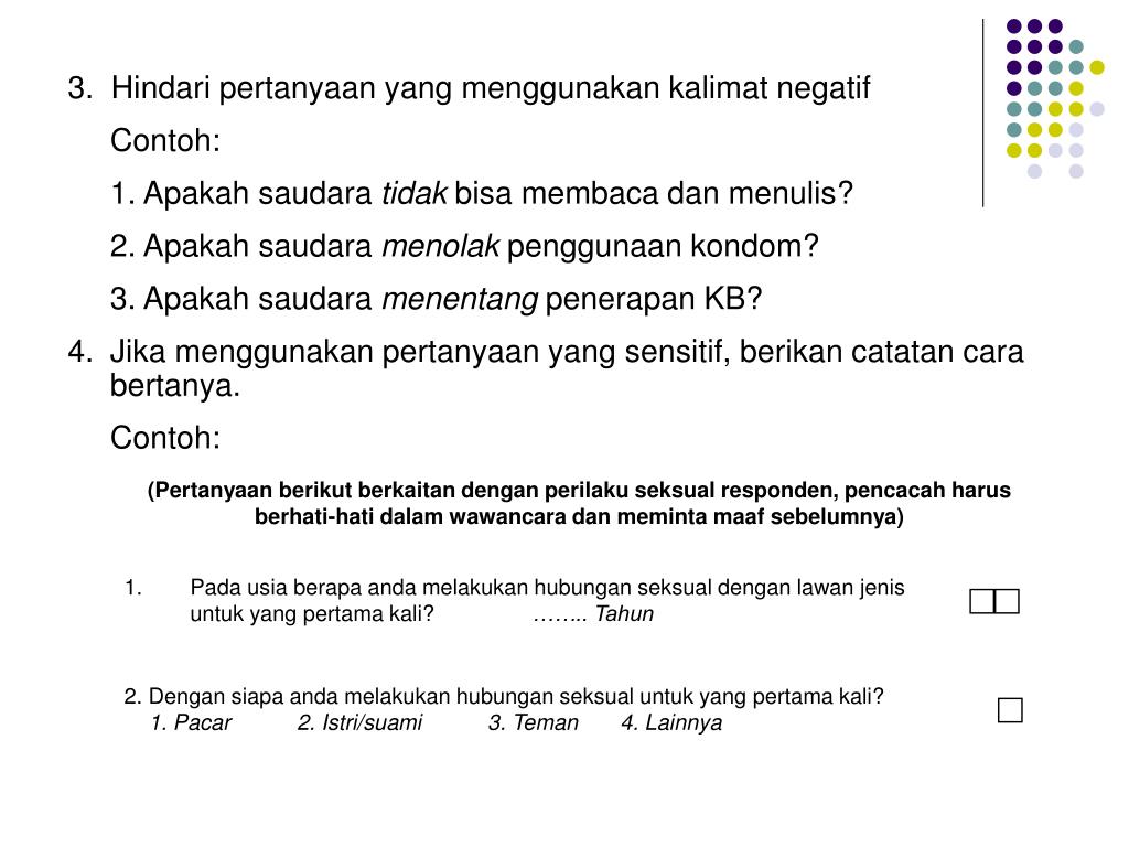 3. Hindari pertanyaan yang menggunakan kalimat negatif • Contoh: • 1. Apakah saudara tidak bisa membaca dan menulis? • 2. Apakah saudara menolak penggunaan kondom? • 3. Apakah saudara menentang penerapan KB? • Jika menggunakan pertanyaan yang sensitif, berikan catatan cara bertanya. • Contoh: