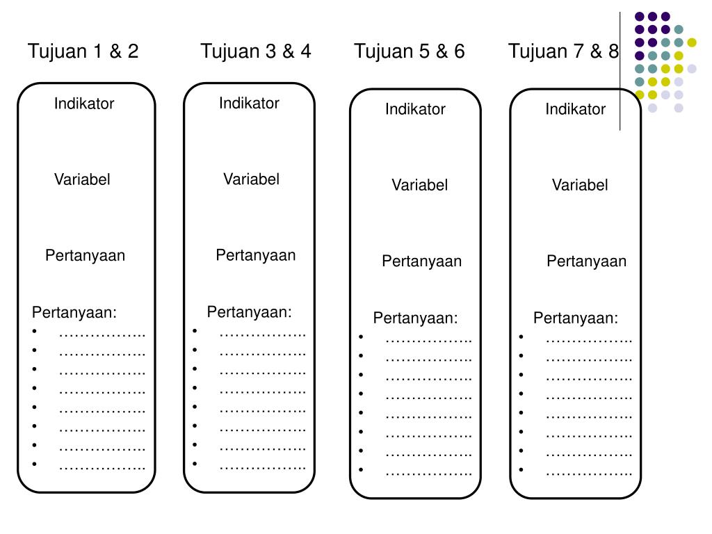 Tujuan 1 & 2 Tujuan 3 & 4 Tujuan 5 & 6 Tujuan 7 & 8 • Indikator • Variabel • Pertanyaan • Pertanyaan: • …………….. • …………….. • …………….. • …………….. • …………….. • …………….. • …………….. • …………….. • Indikator • Variabel • Pertanyaan • Pertanyaan: • …………….. • …………….. • …………….. • …………….. • …………….. • …………….. • …………….. • …………….. • Indikator • Variabel • Pertanyaan • Pertanyaan: • …………….. • …………….. • …………….. • …………….. • …………….. • …………….. • …………….. • …………….. • Indikator • Variabel • Pertanyaan • Pertanyaan: • …………….. • …………….. • …………….. • …………….. • …………….. • …………….. • …………….. • ……………..