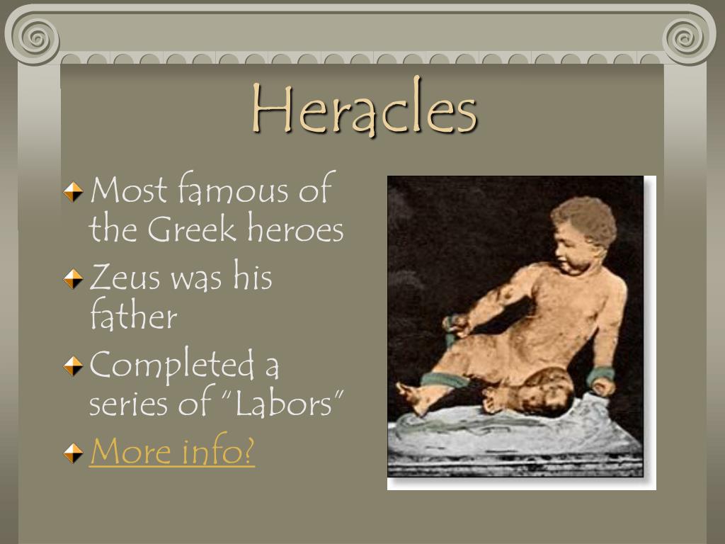 Heracles • Most famous of the Greek heroes • Zeus was his father • Completed a series of “Labors” • More info?