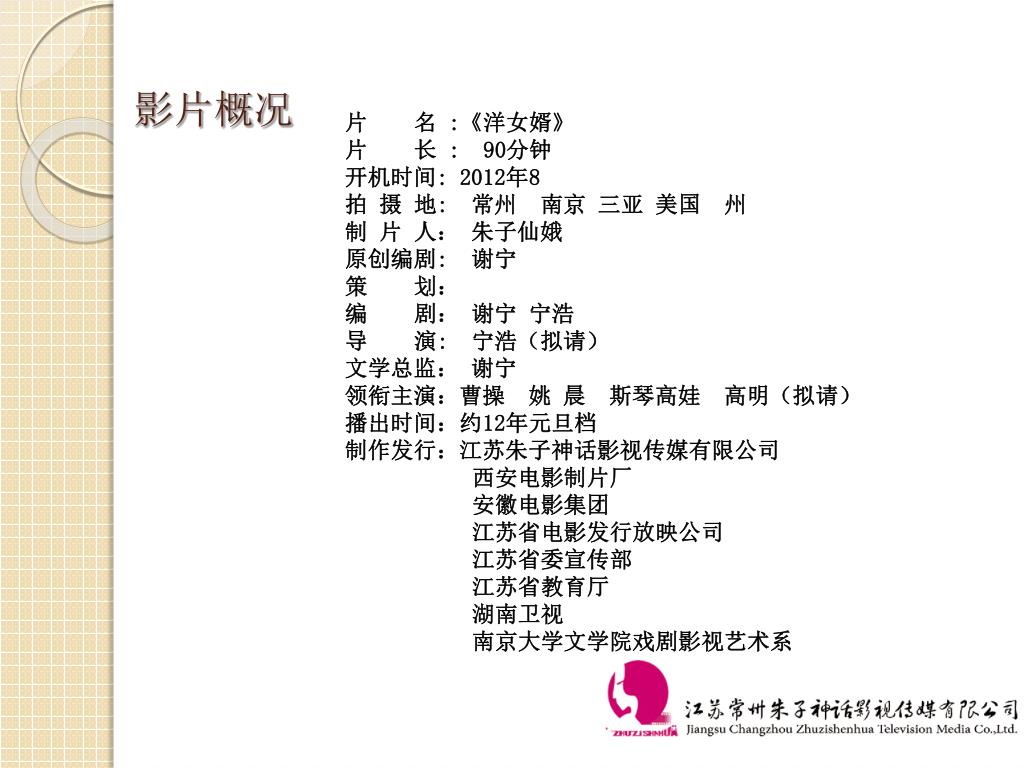 影片概况 片 名 :《洋女婿》 片 长 :90分钟 开机时间: 2012年8 拍 摄 地: 常州 南京 三亚 美国 州 制 片 人: 朱子仙娥 原创编剧: 谢宁 策 划: 编 剧: 谢宁 宁浩 导 演: 宁浩(拟请) 文学总监: 谢宁 领衔主演:曹操 姚 晨 斯琴高娃 高明(拟请) 播出时间:约12年元旦档 制作发行:江苏朱子神话影视传媒有限公司 西安电影制片厂 安徽电影集团 江苏省电影发行放映公司 江苏省委宣传部 江苏省教育厅 湖南卫视 南京大学文学院戏剧影视艺术系