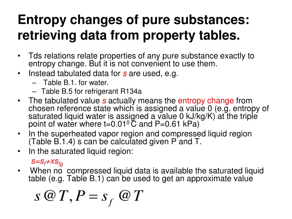 Entropy changes of pure substances: retrieving data from property tables. . Tds relations relate properties of any pure substance exactly to entropy change. But it is not convenient to use them. Instead tabulated data for s are used, e.g. Table B.1. for water.