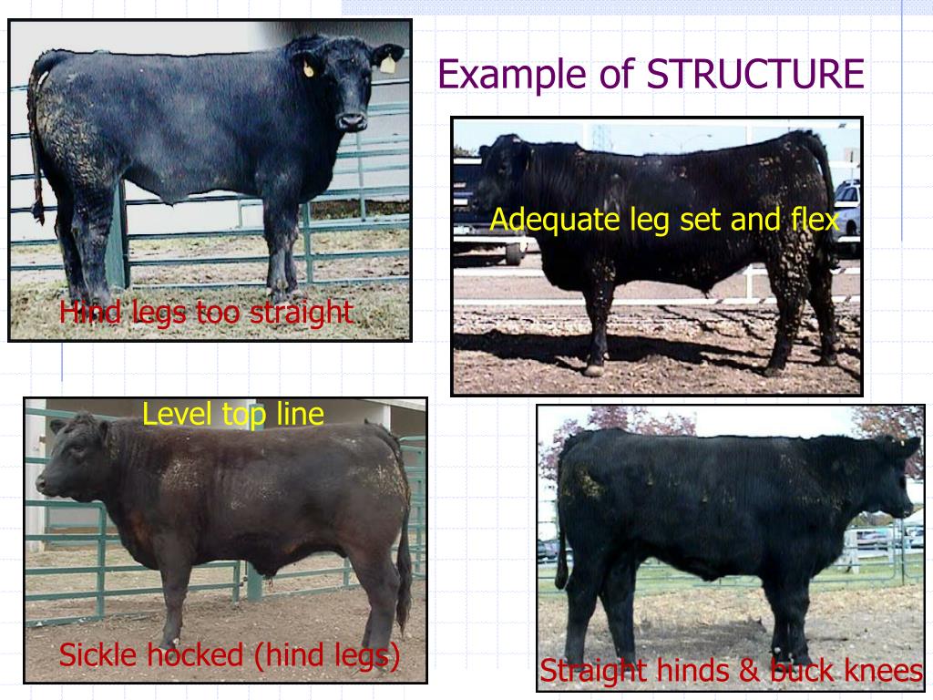Example of STRUCTURE Adequate leg set and flex Hind legs too straight Level top line Sickle hocked (hind legs) Straight hinds & buck knees