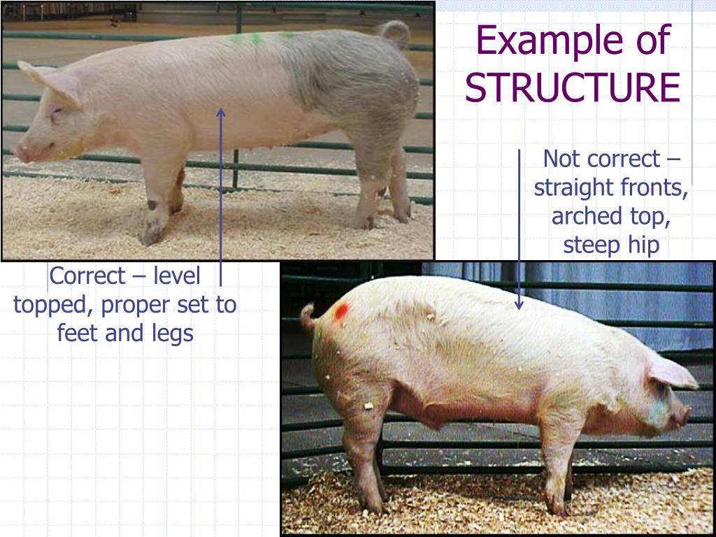 Example of STRUCTURE Not correct – straight fronts, arched top, steep hip Correct – level topped, proper set to feet and legs