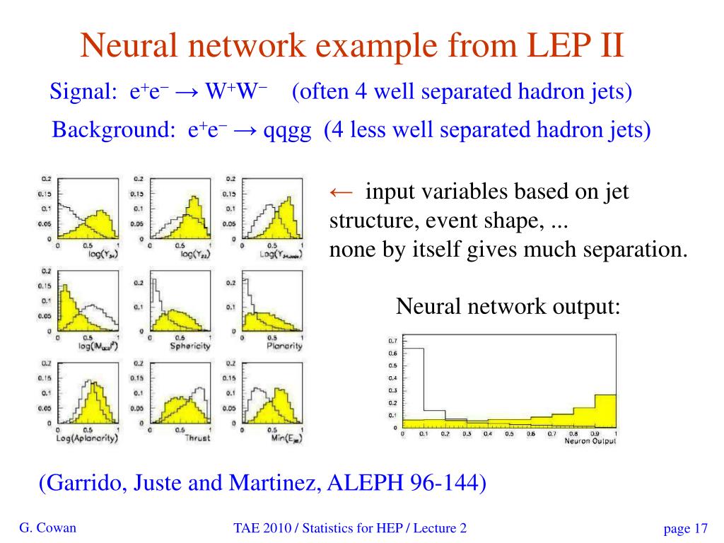 Neural network example from LEP II Signal: e+e-→ W+W- (often 4 well separated hadron jets) Background: e+e-→ qqgg (4 less well separated hadron jets) ← input variables based on jet structure, event shape, ... none by itself gives much separation. Neural network output: (Garrido, Juste and Martinez, ALEPH 96-144) TAE 2010 / Statistics for HEP / Lecture 2