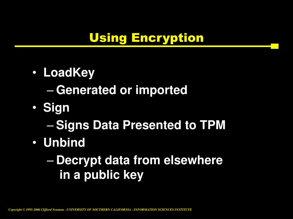Using Encryption • LoadKey • Generated or imported • Sign • Signs Data Presented to TPM • Unbind • Decrypt data from elsewhere in a public key