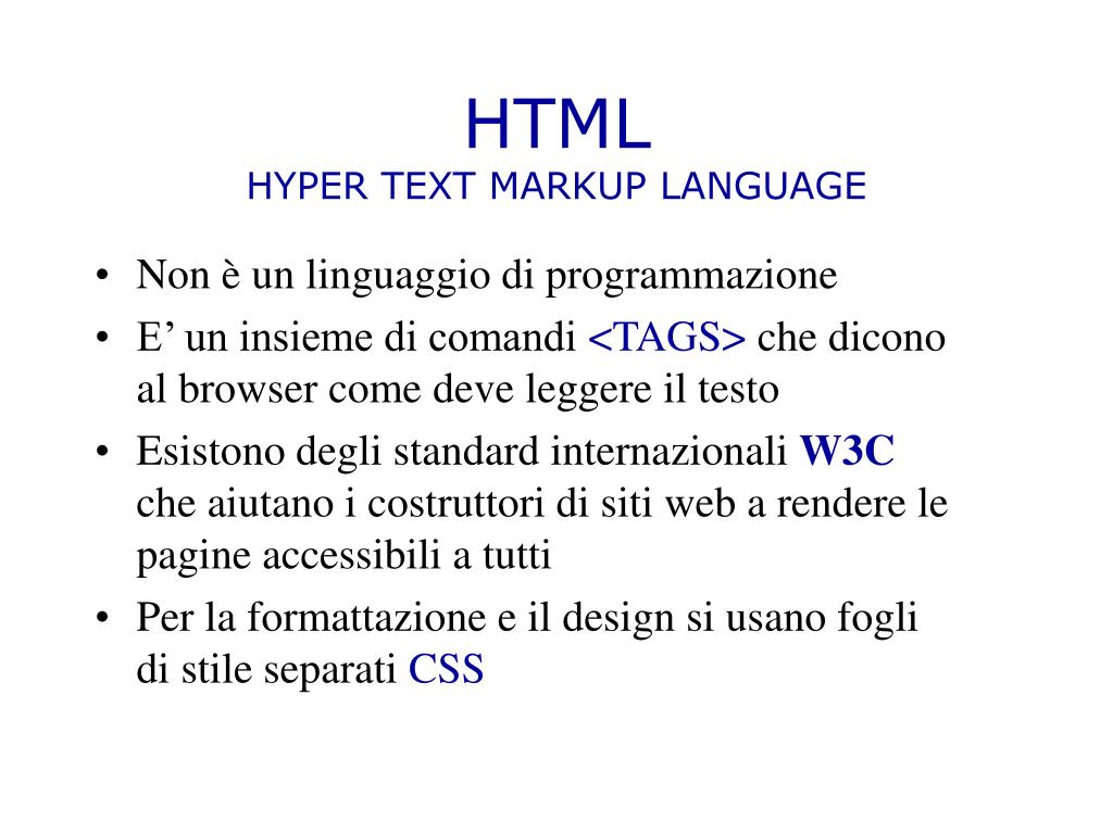 HTMLHYPER TEXT MARKUP LANGUAGE • Non è un linguaggio di programmazione • E’ un insieme di comandi <TAGS> che dicono al browser come deve leggere il testo • Esistono degli standard internazionali W3C che aiutano i costruttori di siti web a rendere le pagine accessibili a tutti • Per la formattazione e il design si usano fogli di stile separati CSS
