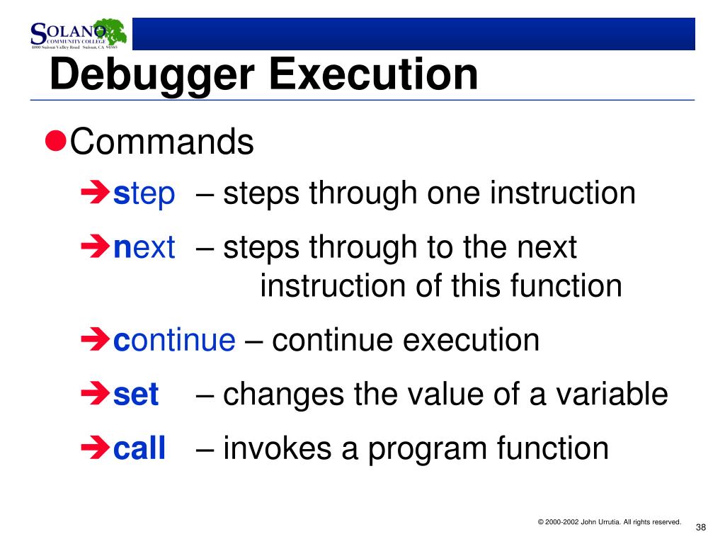 Debugger Execution • Commands • step – steps through one instruction • next – steps through to the next instruction of this function • continue – continue execution • set – changes the value of a variable • call – invokes a program function
