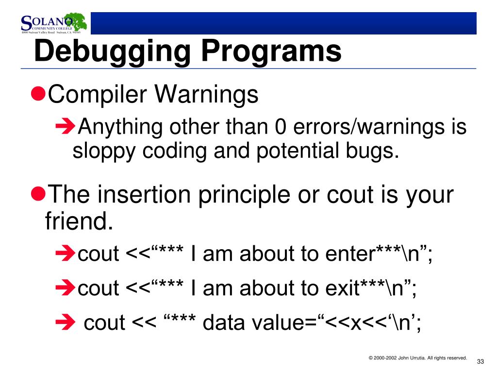 Debugging Programs • Compiler Warnings • Anything other than 0 errors/warnings is sloppy coding and potential bugs. • The insertion principle or cout is your friend. • cout <<“*** I am about to enter***\n”; • cout <<“*** I am about to exit***\n”; • cout << “*** data value=“<<x<<‘\n’;