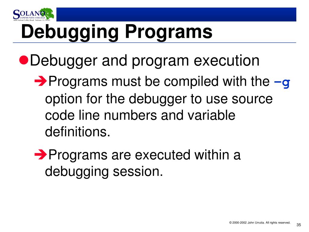 Debugging Programs • Debugger and program execution • Programs must be compiled with the –g option for the debugger to use source code line numbers and variable definitions. • Programs are executed within a debugging session.