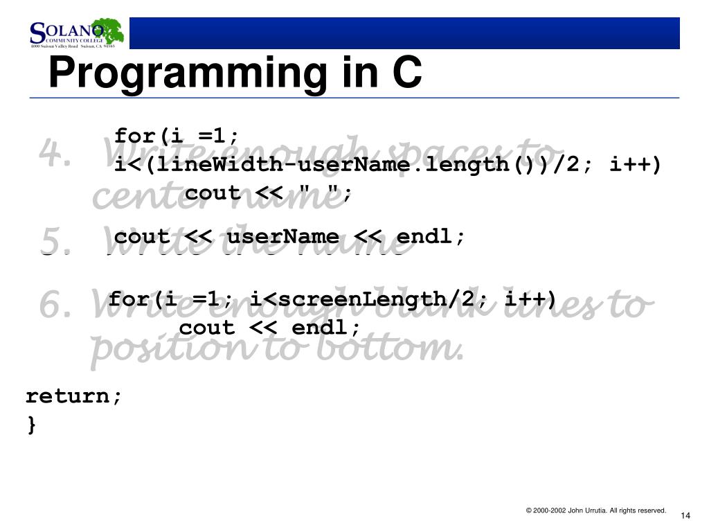 Programming in C • Write enough spaces to center name for(i =1; i<(lineWidth-userName.length())/2; i++) cout << " "; • Write the name cout << userName << endl; • Write enough blank lines to position to bottom. for(i =1; i<screenLength/2; i++) cout << endl; return; }