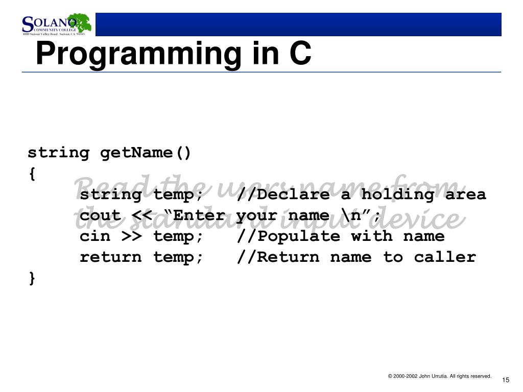 Programming in C Read the users name from the standard input device string getName() { string temp; //Declare a holding area cout << “Enter your name \n”; cin >> temp; //Populate with name return temp; //Return name to caller }