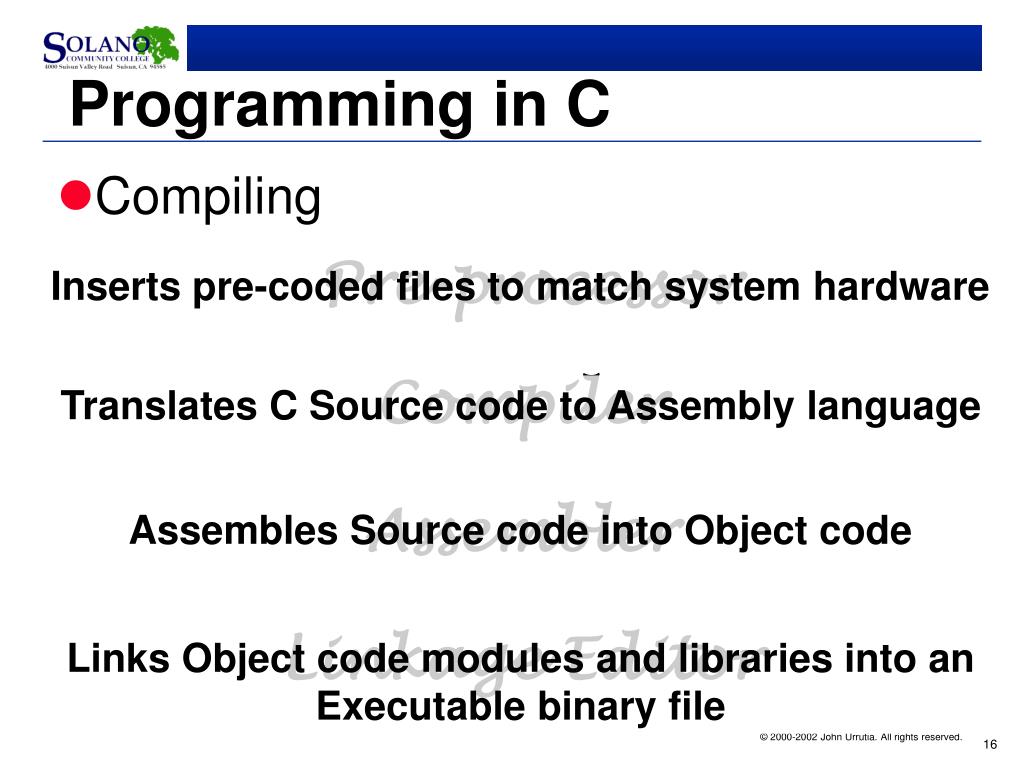 Programming in C • Compiling Pre-processor Inserts pre-coded files to match system hardware Compiler Translates C Source code to Assembly language Assembler Assembles Source code into Object code Linkage Editor Links Object code modules and libraries into an Executable binary file