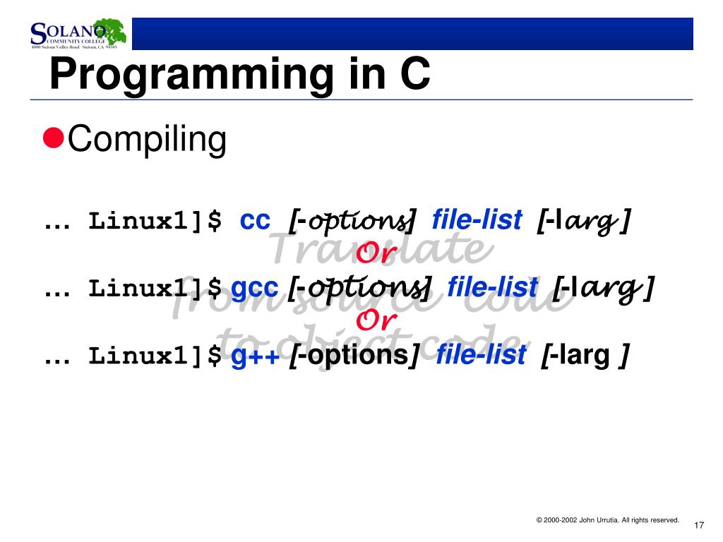 Programming in C • Compiling … Linux1]$ cc[-options] file-list [-larg] Or … Linux1]$gcc[-options] file-list [-larg] Or … Linux1]$g++[-options] file-list [-larg ] Translate from source code to object code