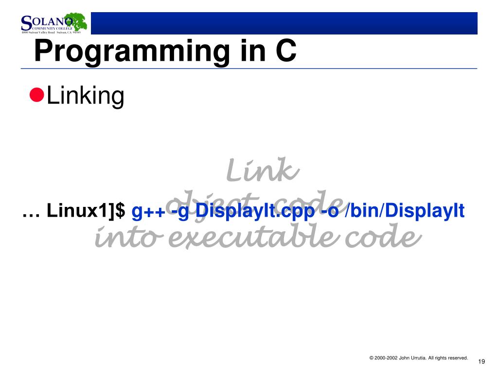 Programming in C • Linking … Linux1]$ g++ -g DisplayIt.cpp -o/bin/DisplayIt Link object code into executable code