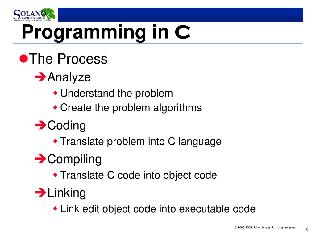 Programming in C • The Process • Analyze • Understand the problem • Create the problem algorithms • Coding • Translate problem into C language • Compiling • Translate C code into object code • Linking • Link edit object code into executable code