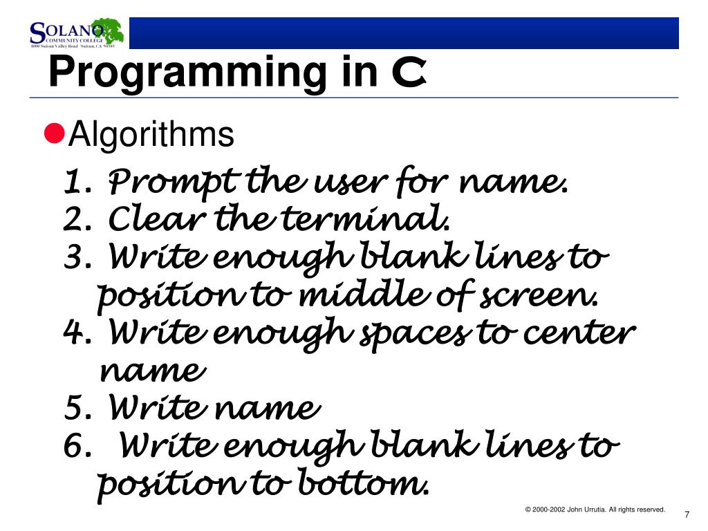 Programming in C • Algorithms • Prompt the user for name. • Clear the terminal. • Write enough blank lines to position to middle of screen. • Write enough spaces to center name • Write name • Write enough blank lines to position to bottom.