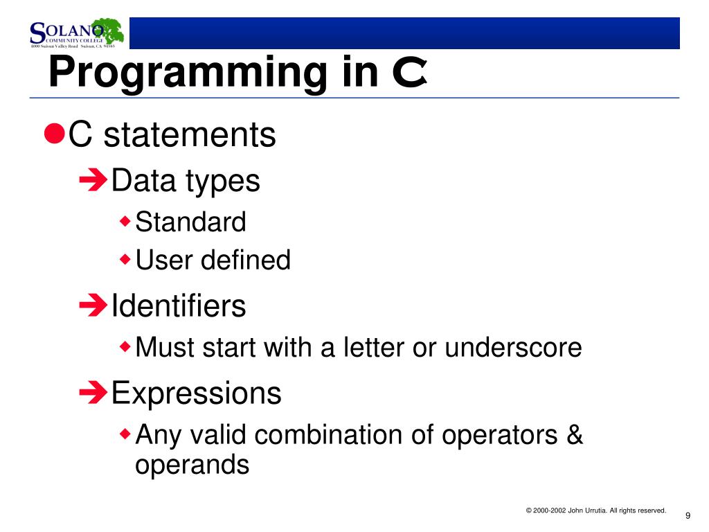 Programming in C • C statements • Data types • Standard • User defined • Identifiers • Must start with a letter or underscore • Expressions • Any valid combination of operators & operands