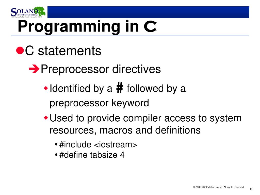 Programming in C • C statements • Preprocessor directives • Identified by a # followed by a preprocessor keyword • Used to provide compiler access to system resources, macros and definitions • #include <iostream> • #define tabsize 4