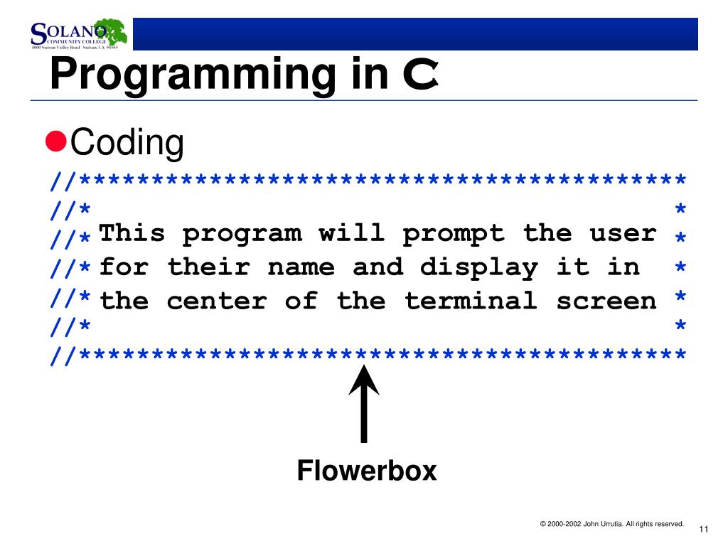 Programming in C • Coding //****************************************** //* * //* * //* * //* * //* * //****************************************** This program will prompt the user for their name and display it in the center of the terminal screen Flowerbox