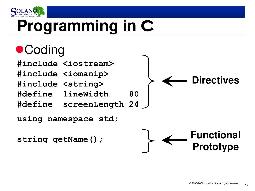 Programming in C • Coding #include <iostream> #include <iomanip> #include <string> #define lineWidth 80 #define screenLength 24 Directives using namespace std; string getName(); FunctionalPrototype