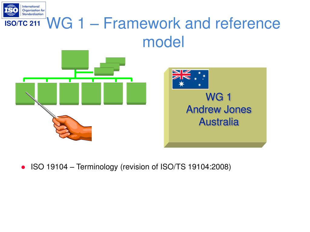 WG 1 Andrew Jones Australia WG 1 – Framework and reference model • ISO 19104 – Terminology (revision of ISO/TS 19104:2008)