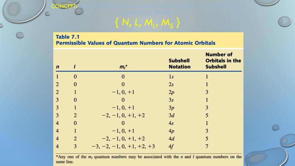 Concept: Each electron in an atom has a unique set of quantum numbers to define it{ n, l, ml, ms } 49