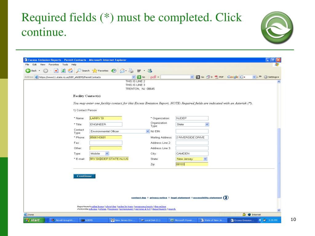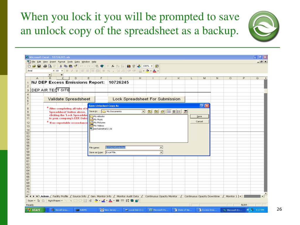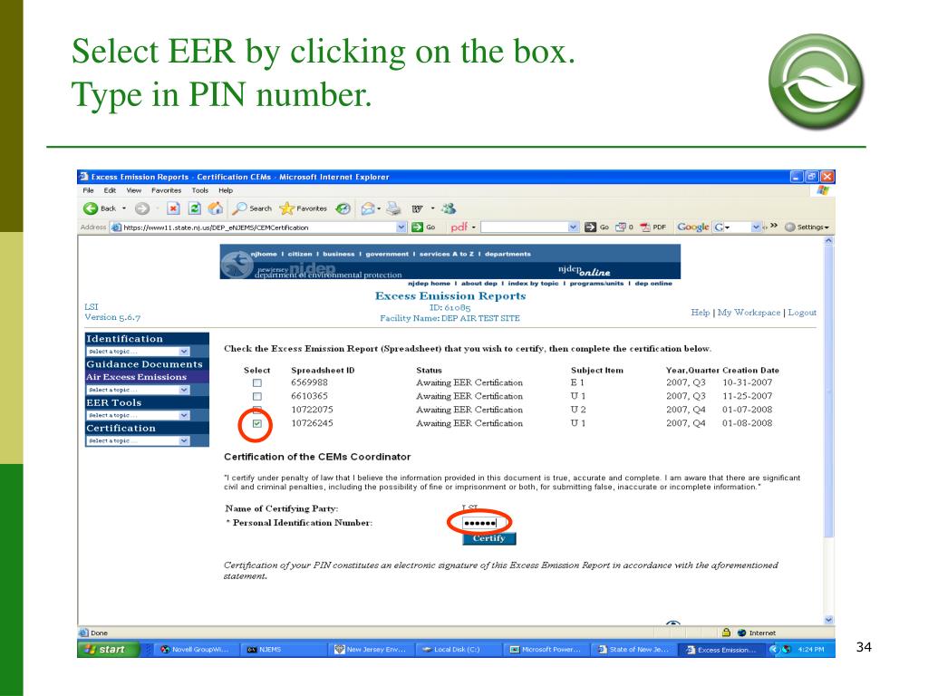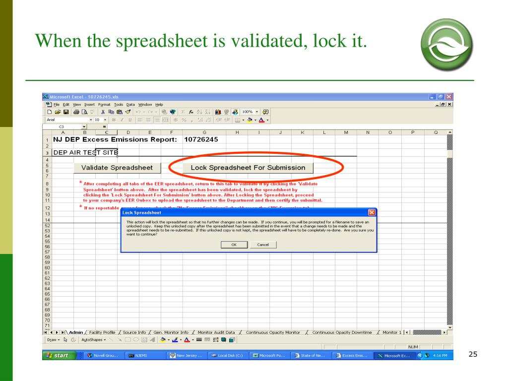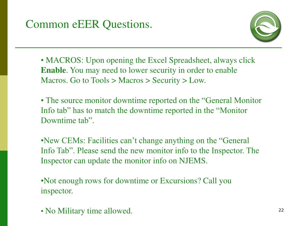 Common eEER Questions. • MACROS: Upon opening the Excel Spreadsheet, always click Enable. You may need to lower security in order to enable Macros. Go to Tools > Macros > Security > Low. • The source monitor downtime reported on the “General Monitor Info tab” has to match the downtime reported in the “Monitor Downtime tab”. • New CEMs: Facilities can’t change anything on the “General Info Tab”. Please send the new monitor info to the Inspector. The Inspector can update the monitor info on NJEMS. • Not enough rows for downtime or Excursions? Call you inspector. • No Military time allowed.
