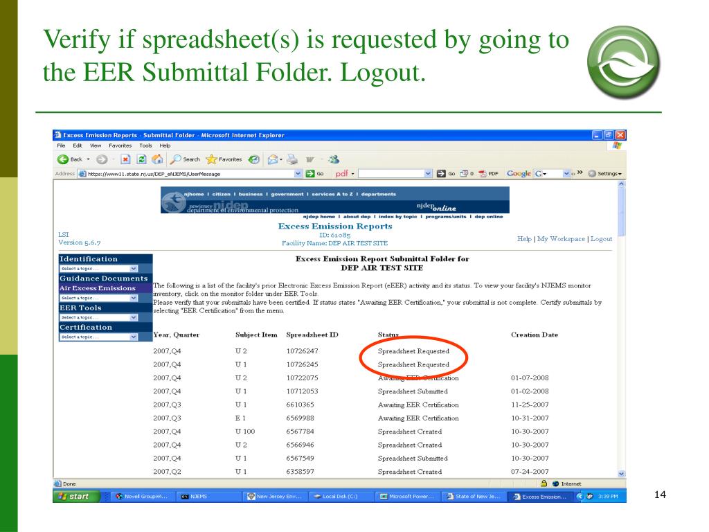 Verify if spreadsheet(s) is requested by going to the EER Submittal Folder. Logout.