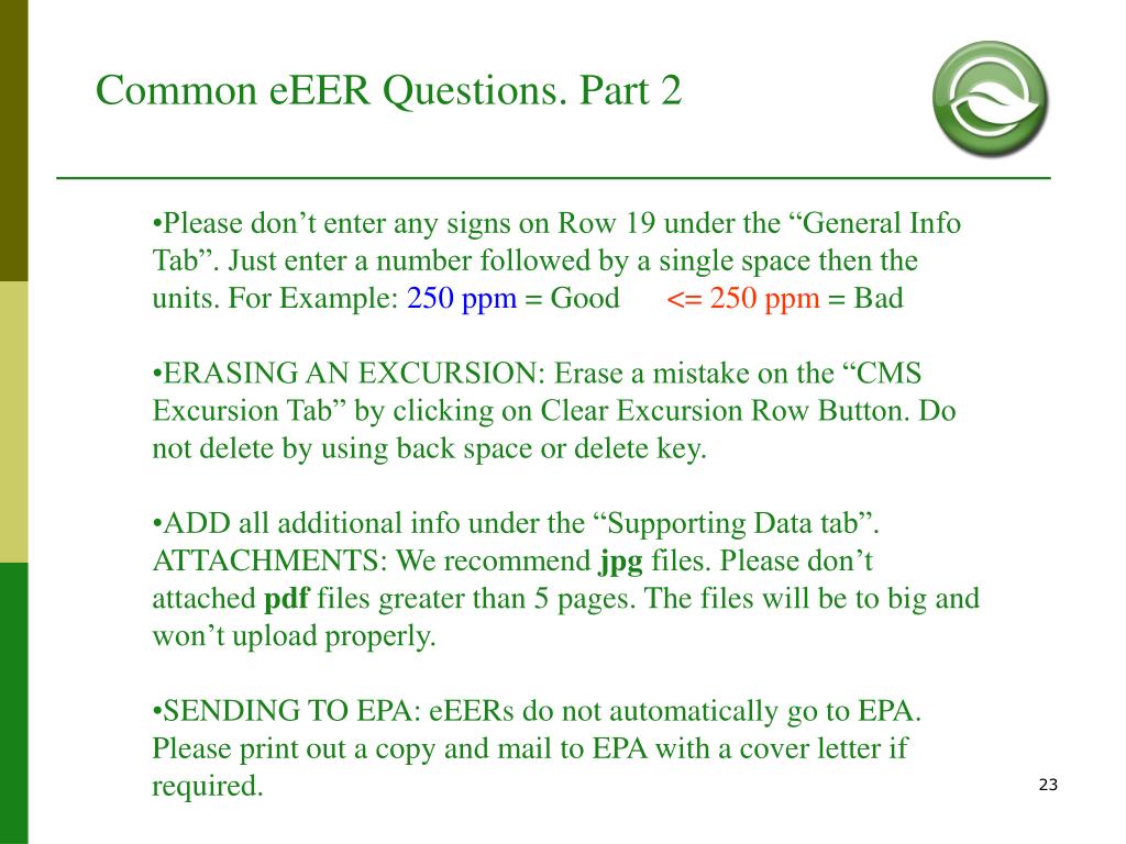 Common eEER Questions. Part 2 • Please don’t enter any signs on Row 19 under the “General Info Tab”. Just enter a number followed by a single space then the units. For Example: 250 ppm = Good <= 250 ppm = Bad • ERASING AN EXCURSION: Erase a mistake on the “CMS Excursion Tab” by clicking on Clear Excursion Row Button. Do not delete by using back space or delete key. • ADD all additional info under the “Supporting Data tab”. ATTACHMENTS: We recommend jpg files. Please don’t attached pdf files greater than 5 pages. The files will be to big and won’t upload properly. • SENDING TO EPA: eEERs do not automatically go to EPA. Please print out a copy and mail to EPA with a cover letter if required.