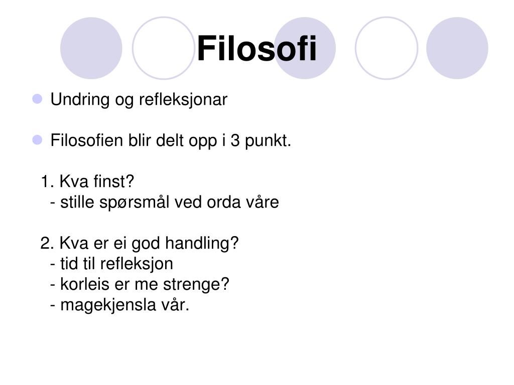 Filosofi • Undring og refleksjonar • Filosofien blir delt opp i 3 punkt. 1. Kva finst? - stille spørsmål ved orda våre 2. Kva er ei god handling? - tid til refleksjon - korleis er me strenge? - magekjensla vår.