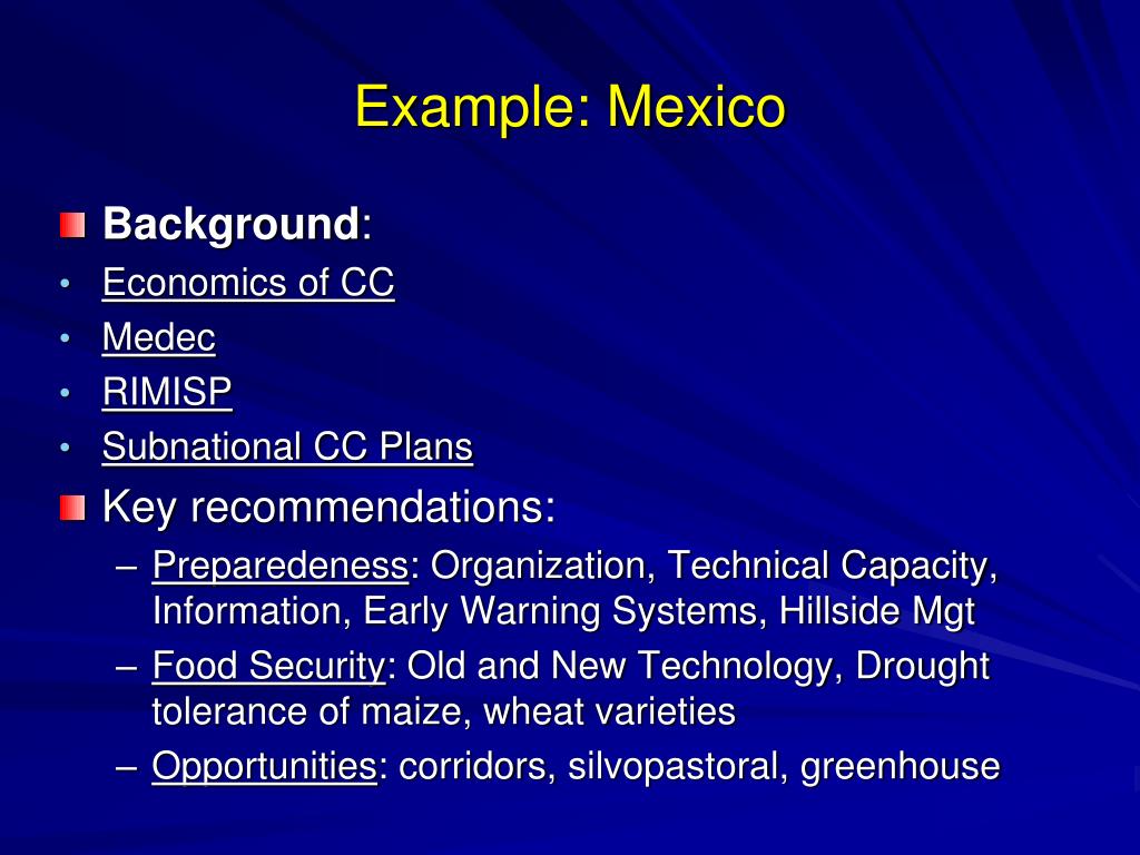 Example: Mexico • Background: • Economics of CC • Medec • RIMISP • Subnational CC Plans • Key recommendations: • Preparedeness: Organization, Technical Capacity, Information, Early Warning Systems, Hillside Mgt • Food Security: Old and New Technology, Drought tolerance of maize, wheat varieties • Opportunities: corridors, silvopastoral, greenhouse