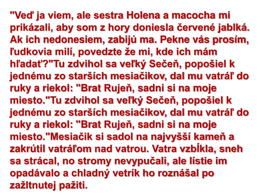 "Veď ja viem, ale sestra Holena a macocha mi prikázali, aby som z hory doniesla červené jablká. Ak ich nedonesiem, zabijú ma. Pekne vás prosím, ľudkovia milí, povedzte že mi, kde ich mám hľadať?"Tu zdvihol sa veľký Sečeň, popošiel k jednému zo starších mesiačikov, dal mu vatráľ do ruky a riekol: "Brat Rujeň, sadni si na moje miesto."Tu zdvihol sa veľký Sečeň, popošiel k jednému zo starších mesiačikov, dal mu vatráľ do ruky a riekol: "Brat Rujeň, sadni si na moje miesto."Mesiačik si sadol na najvyšší kameň a zakrútil vatráľom nad vatrou. Vatra vzbĺkla, sneh sa strácal, no stromy nevypučali, ale lístie im opadávalo a chladný vetrík ho roznášal po zažltnutej pažiti.