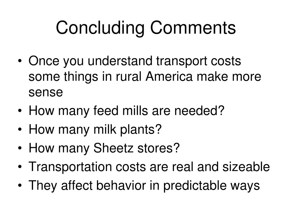 Concluding Comments • Once you understand transport costs some things in rural America make more sense • How many feed mills are needed? • How many milk plants? • How many Sheetz stores? • Transportation costs are real and sizeable • They affect behavior in predictable ways