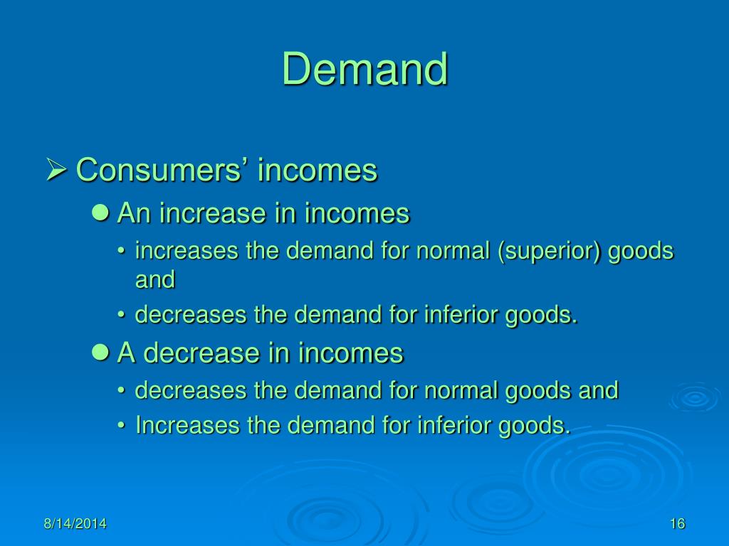 Demand Consumers’ incomes An increase in incomes increases the demand for normal (superior) goods and decreases the demand for inferior goods. A decrease in incomes decreases the demand for normal goods and Increases the demand for inferior goods. 8/14/2014 16