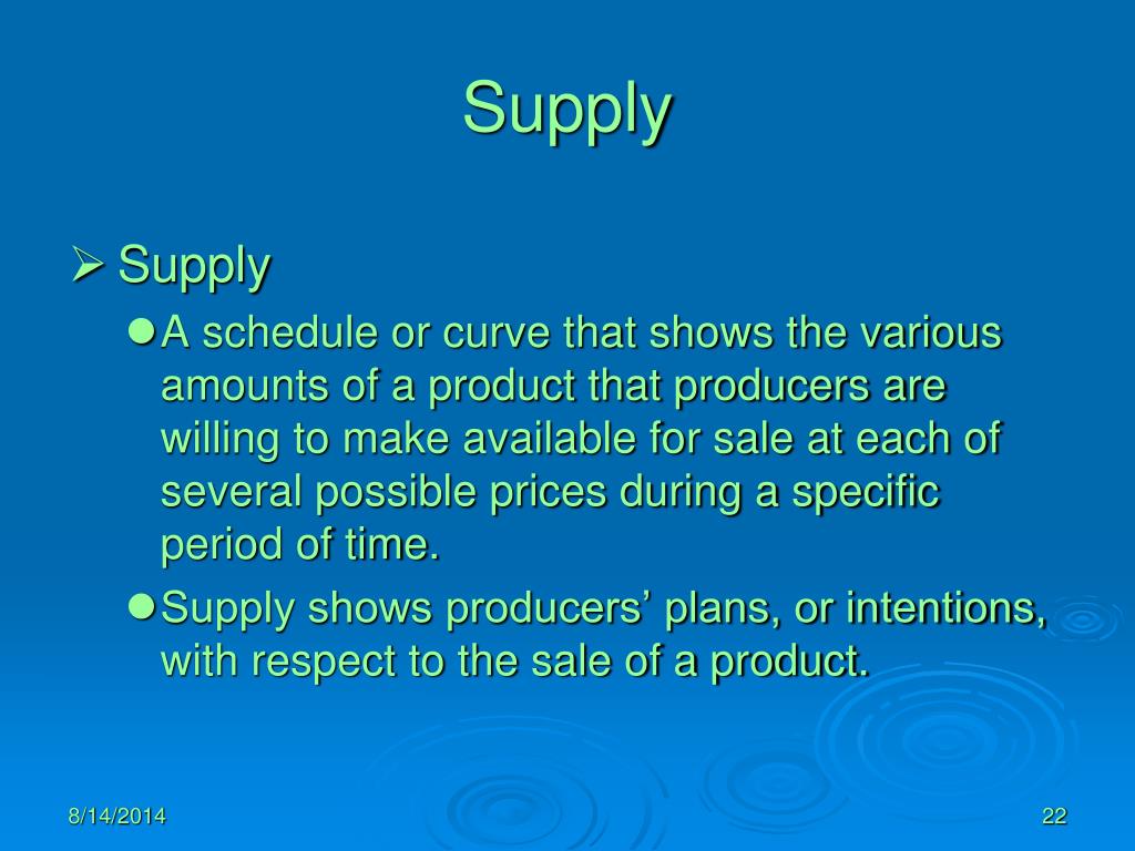 Supply • Supply • A schedule or curve that shows the various amounts of a product that producers are willing to make available for sale at each of several possible prices during a specific period of time. • Supply shows producers’ plans, or intentions, with respect to the sale of a product.