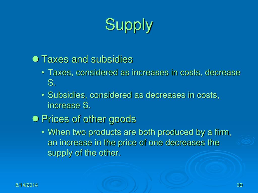 Supply Taxes and subsidies Taxes, considered as increases in costs, decrease S. Subsidies, considered as decreases in costs, increase S. Prices of other goods When two products are both produced by a firm, an increase in the price of one decreases the supply of the other. 8/14/2014 30